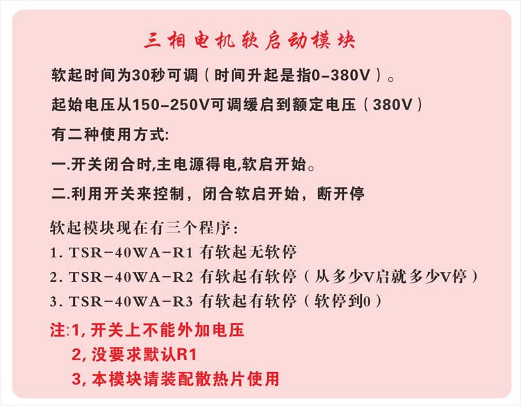 一. 三相電機軟起動模塊特點,全新產品,詳情請來電13636400688 ① 不用信號,可直接軟起,軟起時間(0-30秒)可預設.起始電壓(150-250V)可預設 ② 可控硅輸出,可用于三相星形三角形接法 ③ 使用時需配適當散熱器,必要時加強迫風冷. ④ 本產品是將晶閘管主電路和移相觸發控制電路封裝在一起的多功能功率集成模塊 ⑤ 阻燃工程塑料外殼,銅底板,高溫焊接,瞬間承受過載能力強 ⑥ 主要用途風機調速,力矩電機調速,普通電機軟起動等 二. 三相電機軟起動模塊產品概述 用途:水泵,風機,航車,自耦變壓器等及三相電機軟啟動,替代可調自耦變壓器,變頻器軟啟動等,接線簡單, 不用接旁路接觸器,經濟實用,填補同類產品空白。